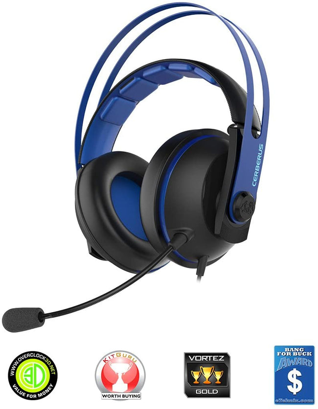 Cerberus V2 gaming headset with 53mm Asus Essence drivers, stainless-steel headband, and wrap-around ear cushions.