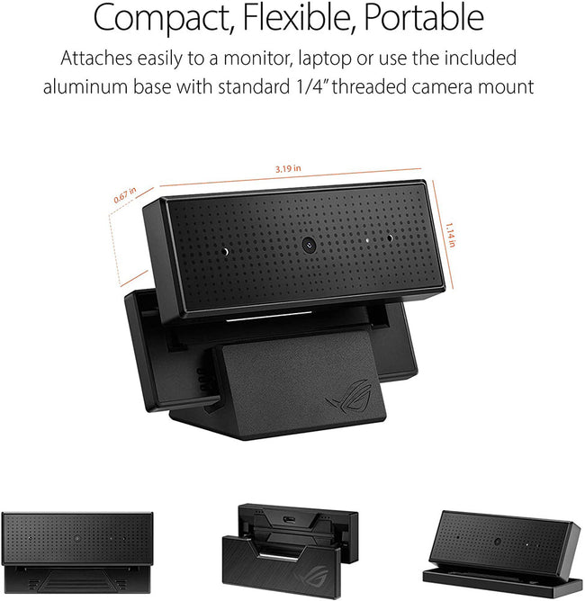 ROG Eye S is compact and slim — folding to just 17 mm thin to slip easily into a pocket. It securely attaches to any modern laptop without effort, and it’s the perfect style match for ROG laptops. For added flexibility, its aluminum-alloy base includes a standard camera mount (1/4" diameter, with 20 threads per inch), so ROG Eye S can be easily attached to a tripod.
