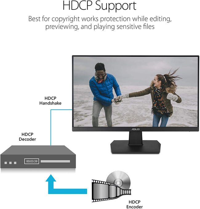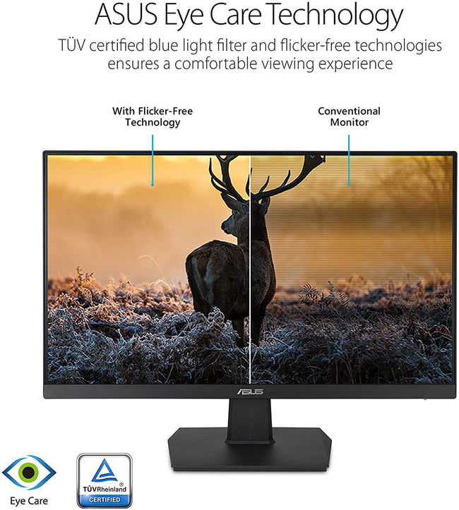 ASUS VA24EHE Eye Care Monitor features 23.8 inch IPS panel with Full HD (1920 x 1080) resolution, providing 178° wide viewing angle panel and vivid image quality. Up to 75Hz refresh rate with Adaptive-Sync technology to eliminate tracing and ensure crisp and clear video playback. In addition, it also features TÜV Rheinland-certified Flicker-free and Low Blue Light technologies to ensure a comfortable viewing experience.