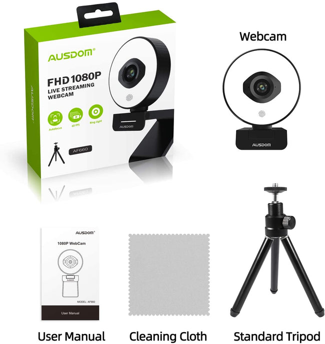 Ausdom AF640 Autofocus 1080P Webcam with Privacy Cover, Full HD Business Web Camera with Dual Noise Reduction Microphones, 90° Wide-Angle View Ausdom AF660 StreamCam with Dual Microphones and Ring Light, USB Computer Auto Focus Web Camera, Stream Webcam 1080P 60fps Ausdom Papalook AF925 Webcam 1080P Full HD, Computer Camera with Microphone, Autofocus Web Cam