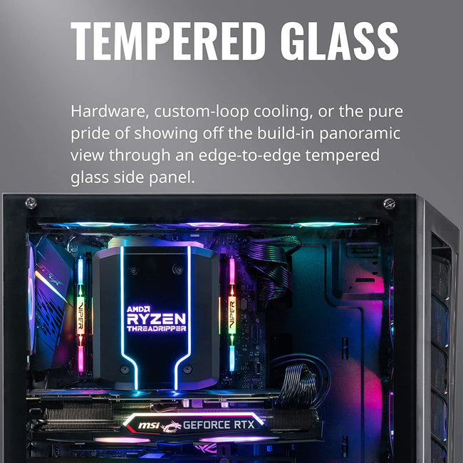 Tempered Glass Side PanelHardware, custom-loop cooling, or the pure pride of showing off the build-in panoramic view through an edge-to-edge tempered glass side panel. |