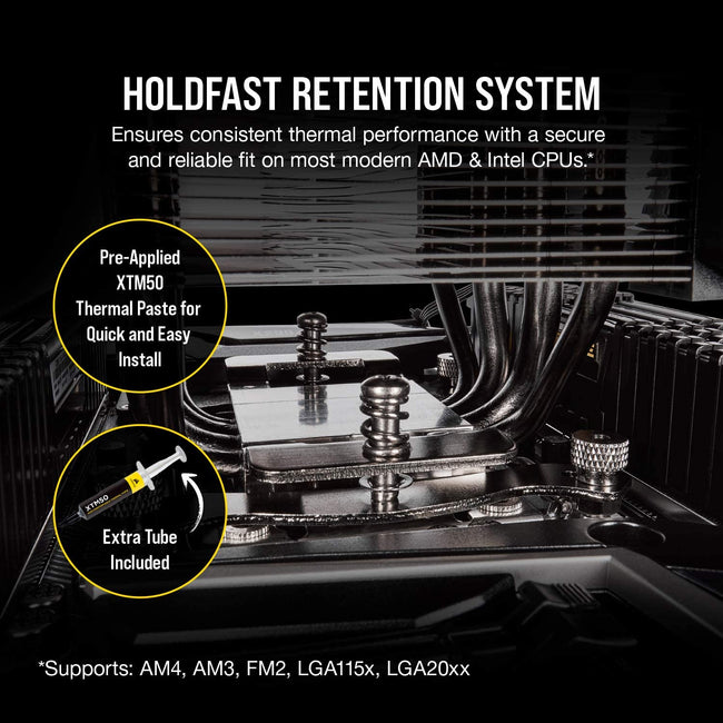 - Corsair holdfast retention system: Easy to install and ensures consistent thermal performance with a secure and reliable fit on almost all modern AMD & Intel CPUs.