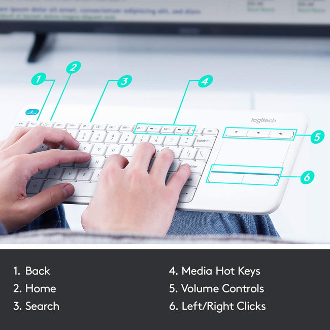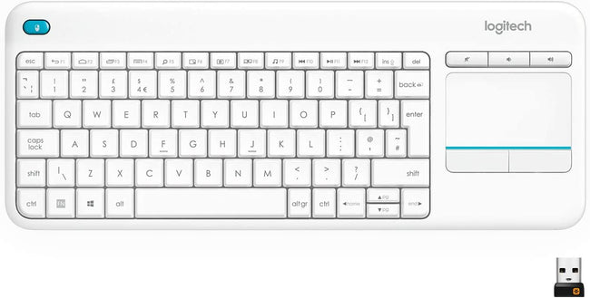 Wireless Touch Keyboard K400 Plus is a full size keyboard layout and touchpad in a compact size. Incurve keys are ideal for touch typists and the soft key stroke makes this a quiet keyboard. The full size touchpad gives you the familiar scroll and navigation gestures. With the left- and right-click buttons below the touchpad and the volume control buttons above, control is at your fingertips. For two-hand control, typically used by those who like to use their thumbs to navigate, a left mouse-click button is located on the upper left side of the keyboard—navigate with your right hand, select with your left.