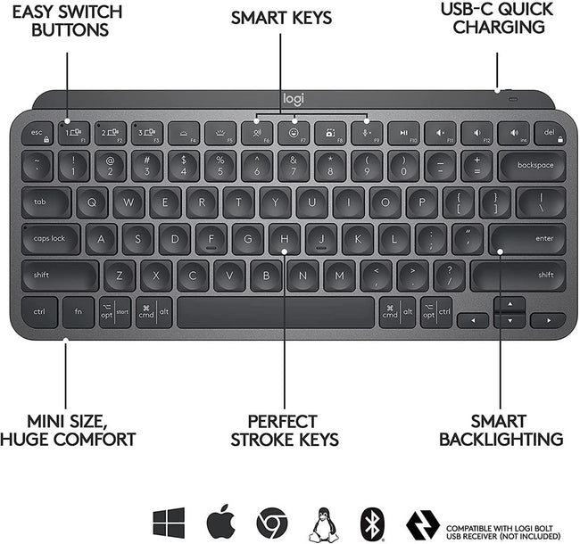 Logitech Keyboard MX Keys Mini Minimalist Wireless Illuminated Keyboard, Compact, Bluetooth, Backlit, USB-C, Compatible with Apple macOS, iOS, Windows, Linux, Android, Metal Build - Graphite