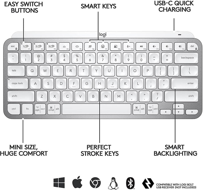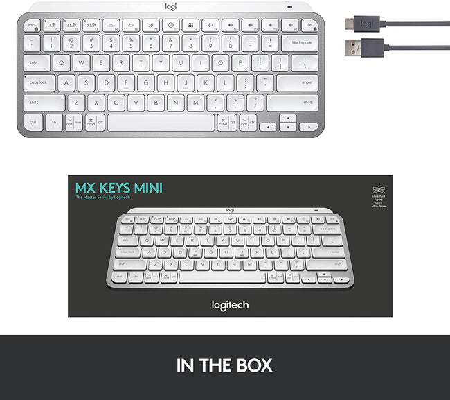 Logitech Keyboard MX Keys Mini Minimalist Wireless Illuminated, Compact, Bluetooth, Backlit, USB-C, Compatible with Apple macOS, iOS, Windows, Linux, Android, Metal Build - Pale Gray