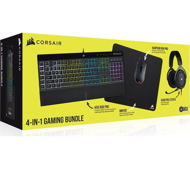 Get all the peripherals you need to kick off your gaming in style with the Corsair 4-in-1 2021 Edition Gaming Bundle. It features a set of Corsair's most popular gaming essentials – the K55 RGB Gaming Keyboard, the HARPOON RGB Pro Gaming Mouse, the HS50 PRO Headset and the MM100 Mousepad.