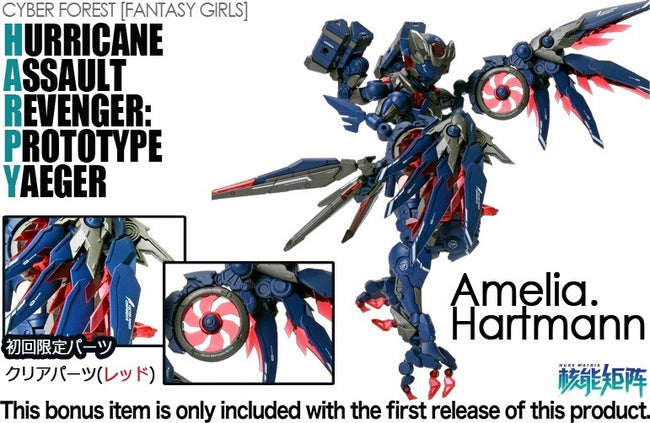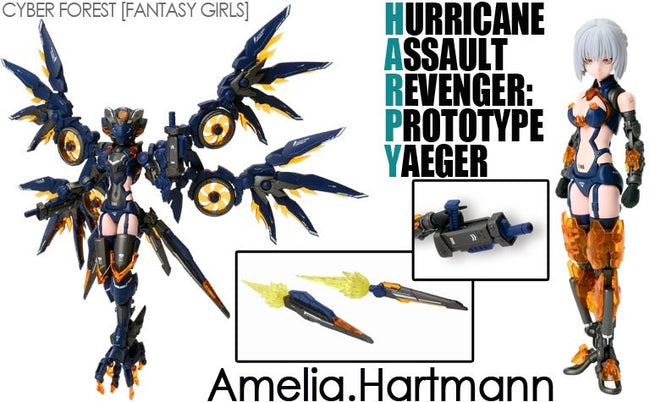 Amelia.Hartmann is the newest entry in the NUKE MATRIX bishoujo figure-kit lineup from Doyusha! Her mech unit is known as HARPY (Hurricane Assault Revenger Prototype Yaeger), and Amelia is equipped with two machine guns and four missile launchers, which can be combined together if you like; she also has effect parts for a sense of dynamism. Order her for your own collection today!