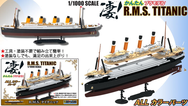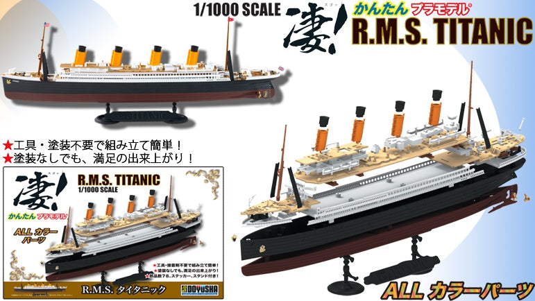 The legendary R.M.S. Titanic is now an easy-to-assemble plastic model kit from Doyusha -- neither paint nor glue are required! Stickers are included for its markings, and it also comes with a stand for display. It's great for beginners, and also for more experienced modelers who want a relaxing build. Place your order today!
