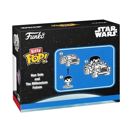 Your favorite Star Wars Pop! figures have been shrunk into Funko Bitty Pop! mini-figures! Expand your Funko Bitty Pop! collection with the Star Wars Han Solo and The Millennium Falcon Funko Bitty Pop! Ride! Standing about 1-inch tall, the Star Wars Han Solo Funko Bitty Pop! Mini-Figure #321 comes packaged in a hard acrylic display case with a detachable bottom lid. The detachable bottom lid doubles as an acrylic base, to which the Bitty Pop! mini-figure is adhered. Remove Han Solo from his display case so he can take a seat in The Millennium Falcon! Comes packaged in a window display box.
