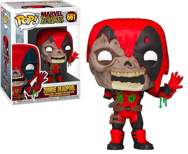 Zombie Deadpool #661 Marvel Zombies: Funko Pop. The figure stands 3 3/4" tall. Window box packaging. Collect the entire line of Marvel Zombies Funko Pop Vinyls Deadpool, Hulk, Wolverine, Black Panther, Mysterio, Gambit.