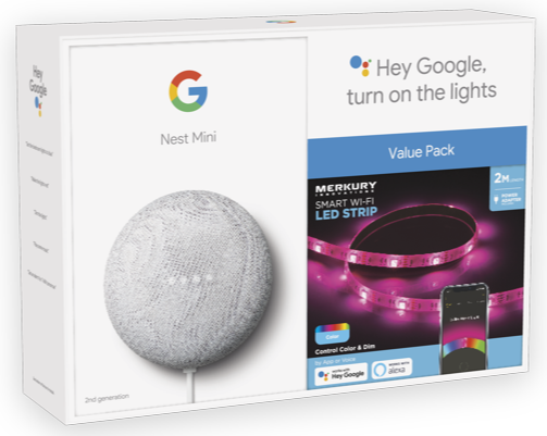 - Set up your devices: Plug in your Nest Mini (chalk) and set up in the Google Home App. Plug in your Merkury LED strip and set up in the Geeni app. In the Google Home app, connect your Geeni account to your Google Account. See instructions in the box for more details.