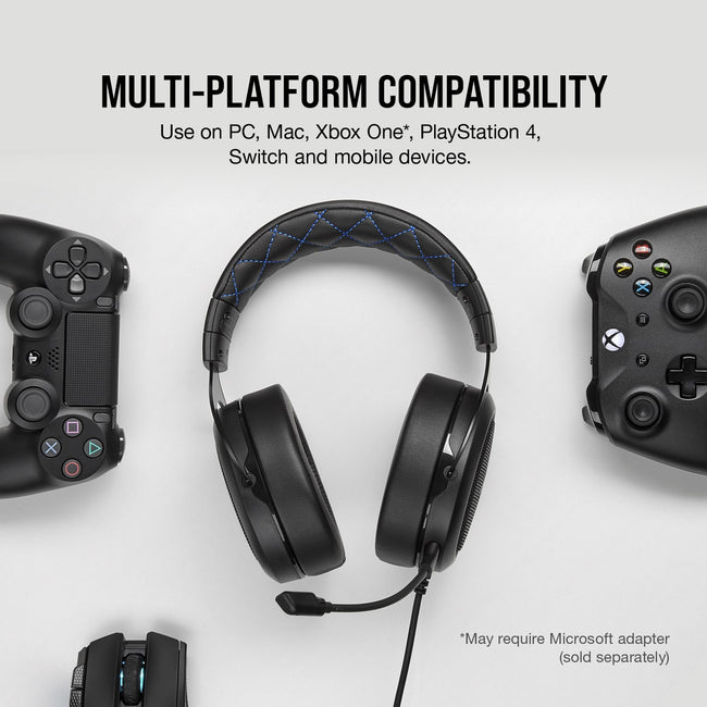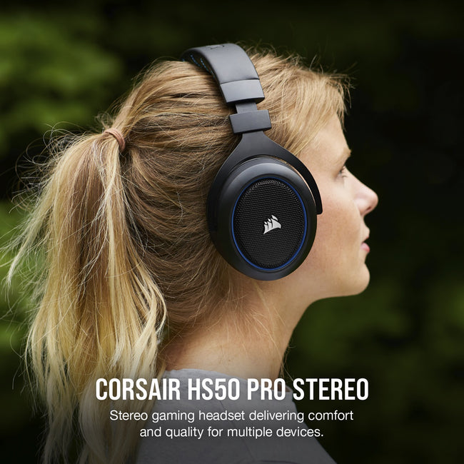 The Corsair HS50 Pro stereo gaming headset delivers both comfort and quality with memory foam ear pads and custom-tuned 50mm neodymium audio drivers, built to last thanks to its lightweight and durable construction. A detachable noise-cancelling unidirectional microphone helps your voice come through loud and clear, and a 3.5mm audio connector ensures compatibility with nearly every platform, including PC, Xbox one, PS4, Nintendo switch, and mobile devices. Complete with on-ear volume and mute controls for convenient audio adjustments, The HS50 Pro is crafted for comfort and built for battle.