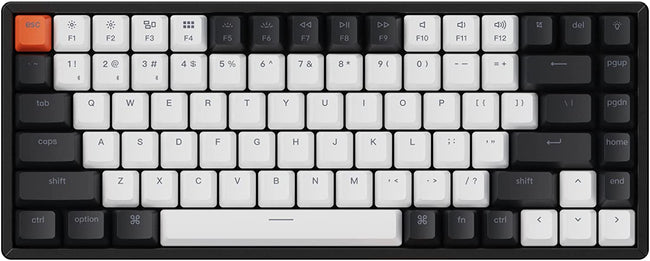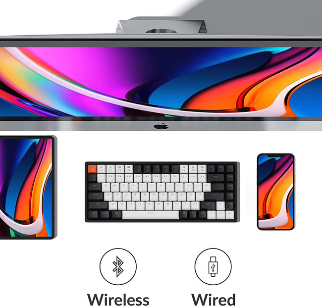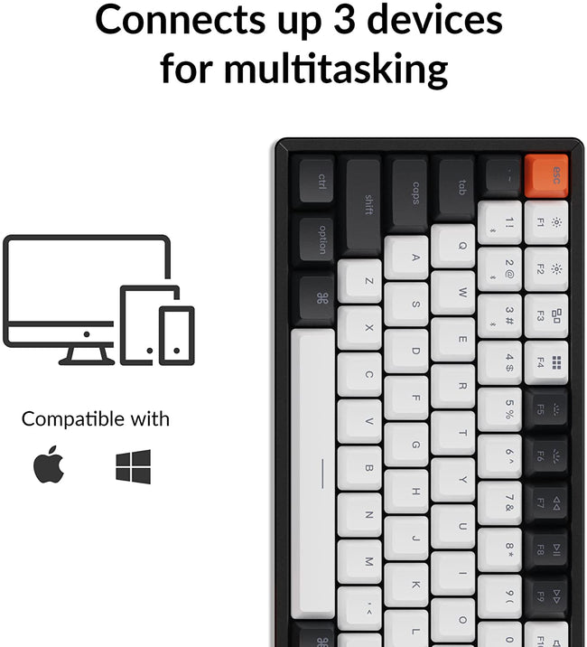 Keychron K2 is a hot-swappable 75% layout (84-key) RGB LED backlight Bluetooth mechanical keyboard Aluminum frame. The K2 is crafted to maximize your workspace and enhance productivity.