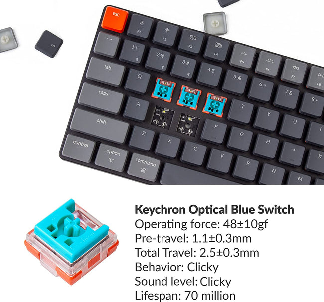 The low-profile optical switch is 40% slimmer than conventional switch with a stable MX style stem and ultra-low latency, the light actuated switch is crafted for typists or gamer with unrivaled linear responsiveness and up to 70 million keystroke lifespan.