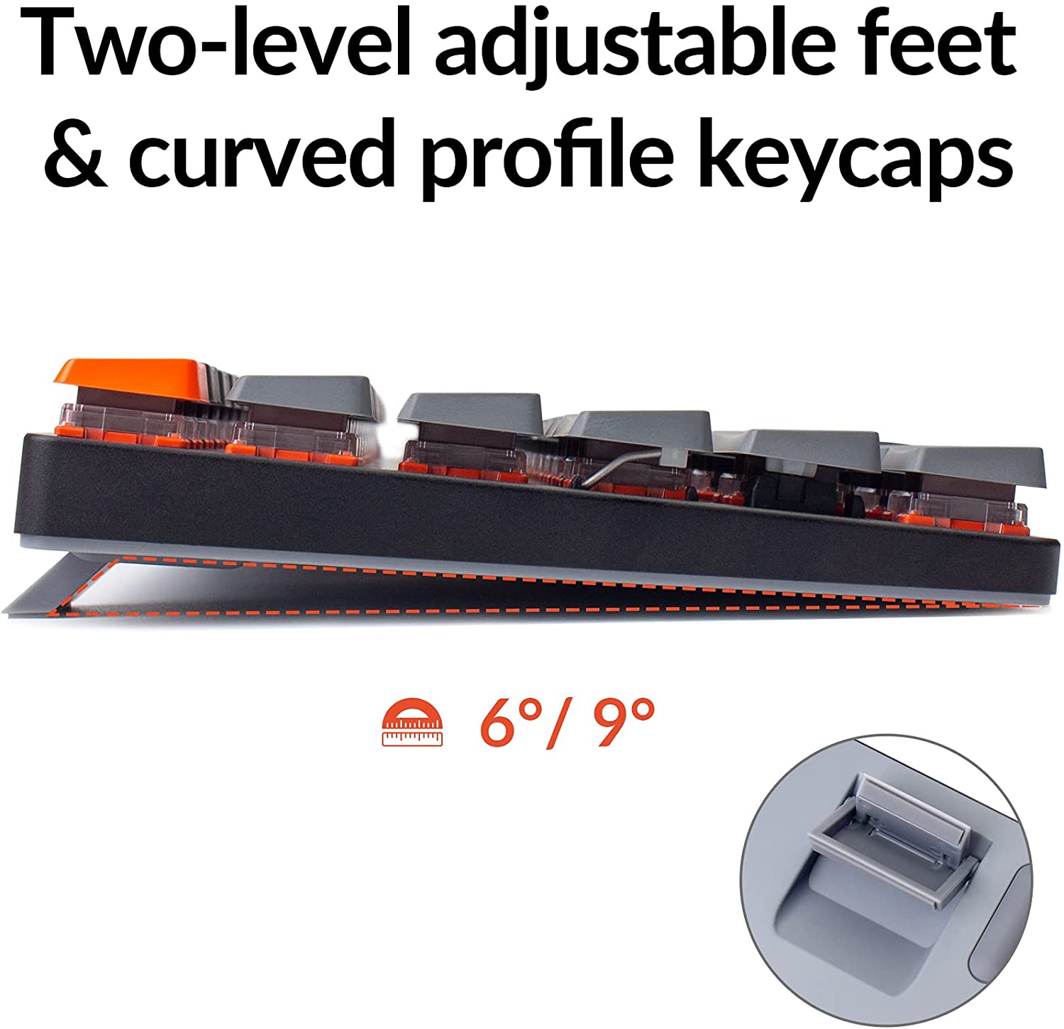 Ergonomic SupportEngineered with two levels of adjustable feet, inclined bottom frame and curved keycaps to provide long-lasting ergonomic support for when you're typing on the K3. |