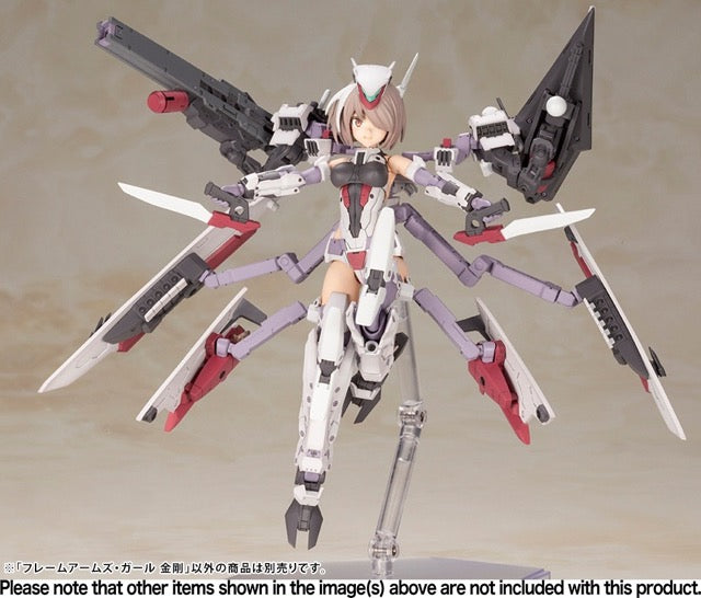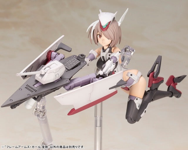 Kotobukiya adds their original character Kongo to the "Frame Arms Girl" figure-kit lineup! Designed by Takayuki Yanase, Kongo has been turned into a figure based on an illustration by Fumikane Shimada! This completely new Frame Arms Girl kit can reproduce various forms by transforming and recombining the large armaments; she comes with standard hands and feet. Her head can be changed from an armed state to an unarmed state; she comes with three prepainted face parts, too. Her waist armor is movable, and the range of motion of her thighs is expanded. The bazooka and shield come with left and right grips that can be exchanged; the missile mounted on her back armor can be deployed by opening the hatch. The dagger mounted on her back armor can also be used as a handheld weapon. Decals are included for her eyes,and five sets of PVC hands are included. She's also equipped with 3mm-diameter ports on her arms and legs, so she can use weapons and armor from the "M.S.G" and "Frame Arms" series too! Order her for your own collection now!