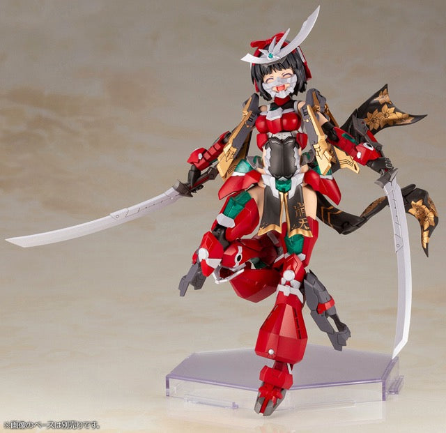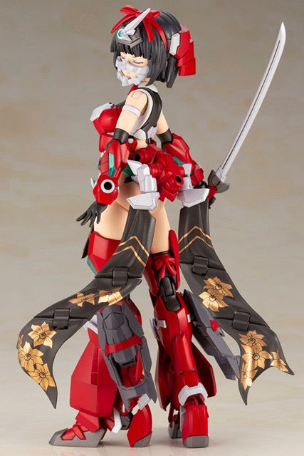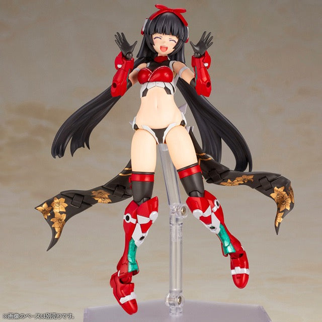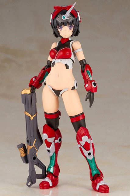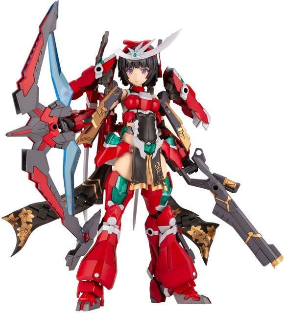 Say hello to Frame Arms Girl Magatsuki Houten! The newest member of Kotobukiya's "Frame Arms Girl" figure-kit lineup, she was designed by ToMo and based on an illustration by Eiji Komatsu. She's specialized for attacks, with her large Kyoten firearm and rifle-type Ootori weapon -- both of which are newly molded. The Ootori can be used as a bayonet by attaching the blade parts to the bottom of the barrel; it can also be stored on the back-mounted weapons rack with the dedicated attachment part. Additional propellers are attached to her shoulders and legs, and a loincloth is included. Decals are included for the gleaming golden letters and patterns! Her hairstyle has been changed to a short cut; a long-hair part and extra bangs are included too. Four tampo-printed faces are included; her armor is molded in crimson and clear parts. Additional armor can also be attached with 3mm diameter joints. Two sets of exclusive weapons are included too: the Odachi-type Tenkai and the Wakizashi-type Satsuga; clear blades with effect parts are included for both. You can choose between two different types of headgear -- one large and one small -- and a simplified round base is included. Of course, she's highly posable after assembly, with pull-out joints in her chest and shoulders allowing her to handle her swords with ease! Five interchangeable sets of hands are included too, and the 3mm-diameter ports on her arms and legs allow the use of weapons from Kotobukiya's "M.S.G" and "Frame Arms" series as well! Order her today!