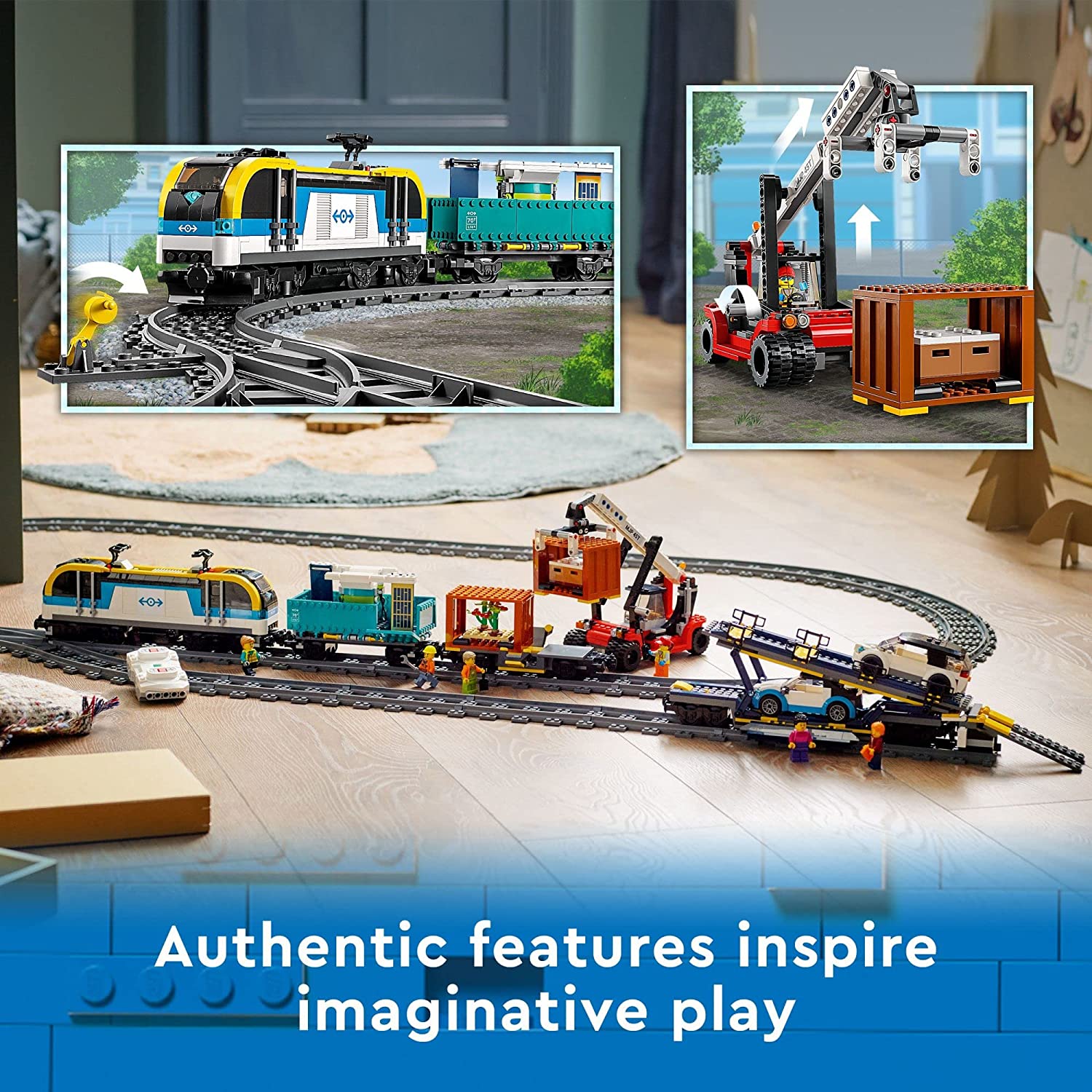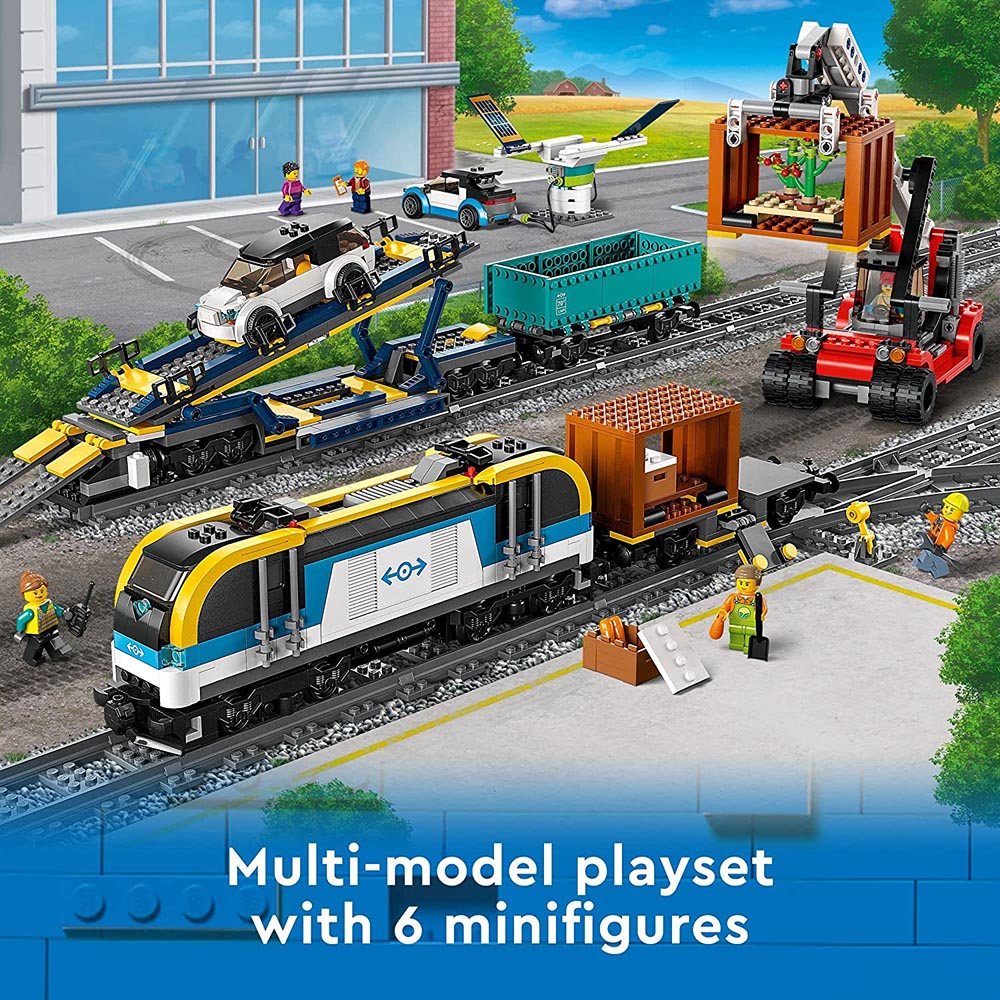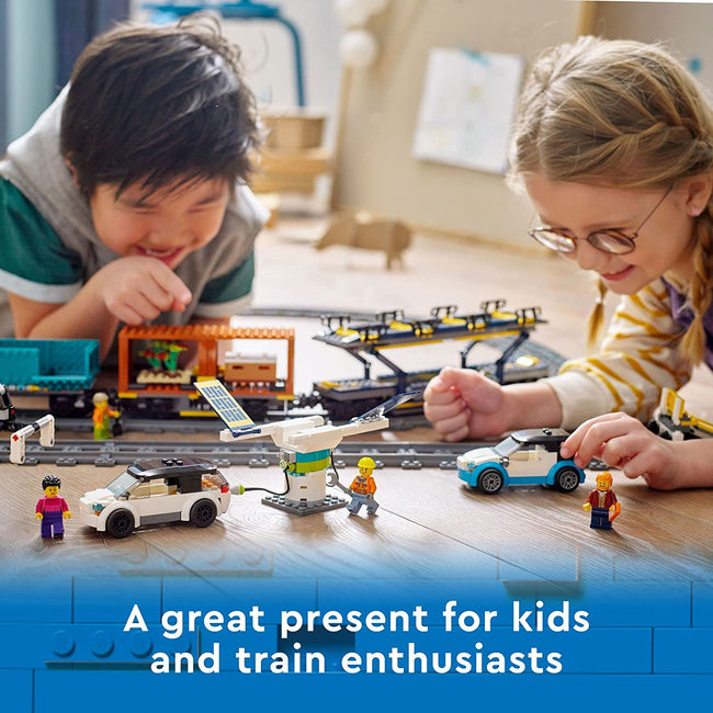 LEGO Powered Up train set with a locomotive, flatcar, open wagon, auto carrier, 2 EVs, a reach stacker and 6 minifigures.