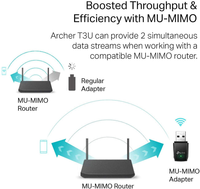 With MU-MIMO technology, the Archer T3U can provide two simultaneous data streams, improving the throughput and efficiency of the entire network and enabling you to take full advantage of MU-MIMO routers**.