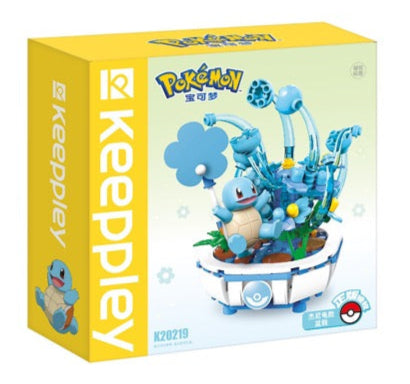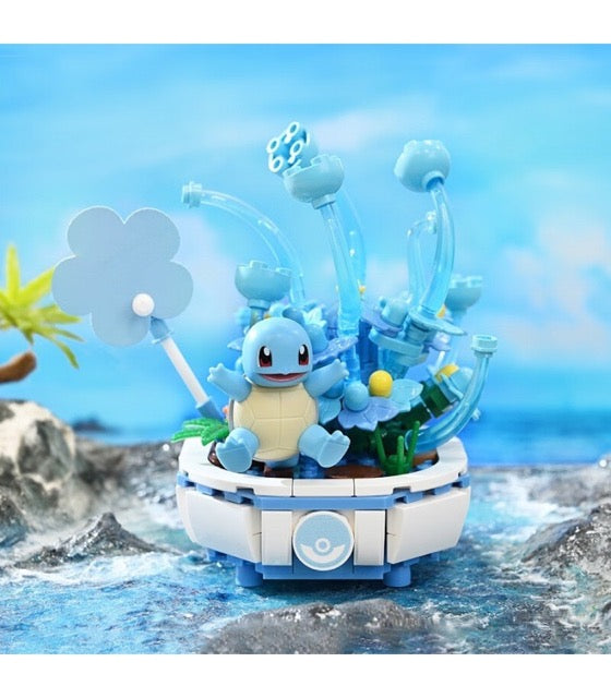 The Squirtle is a water-based Pokémon with large purple red eyes, three toed limbs, and a small wavy tail. Squirtle's body is light blue and wrapped in a hard turtle shell. This model is an exquisite potted plant constructed from building blocks as a whole. It comes with a cute Squirtle doll, a beautiful sea blue pine, a flower shaped decorative accessory, and some other green plants.
