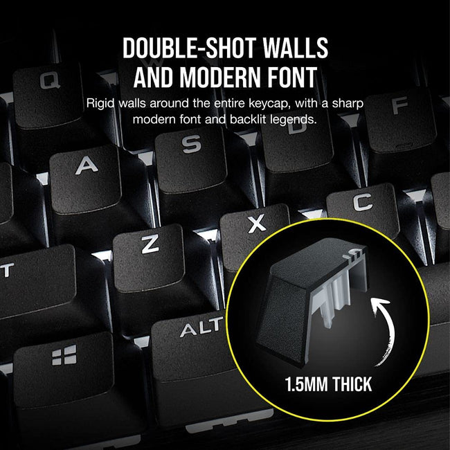 A CORSAIR PBT DOUBLE-SHOT PRO Keycap Mod Kit gives your keyboard added durability and personalization. Rigid 1.5mm-thick double-shot PBT keycaps include a textured surface for added grip and stability that resists wear, fading, and shine. The full-size keyboard set includes a standard bottom row layout, making it compatible with any CORSAIR mechanical and optical-mechanical keyboard with a standard bottom row, such as the CORSAIR K100 RGB, and all other MX keyboards. Multiple striking color options accentuate your desktop aesthetic, while included optional O-ring dampeners soften keystrokes for a quieter and more comfortable experience when gaming or typing. For long-lasting durability and a vibrant color variety, customize like a pro with PBT DOUBLE-SHOT PRO.