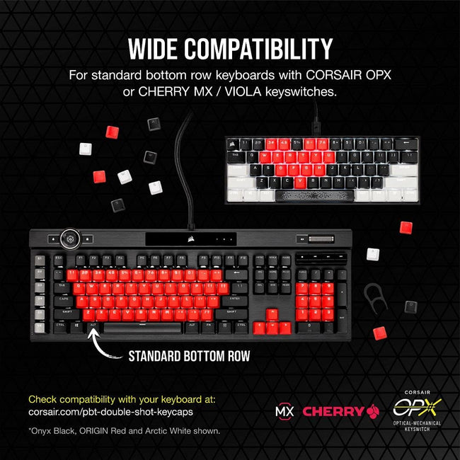 Compatibility: This full-size keycap set is compatible with all CORSAIR mechanical and optical-mechanical keyboards with a standard bottom row as well as all other CHERRY MX-compatible keyboards.*