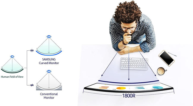 Designed to closely match the way the human eye views objects, the 1800R ultra-curved screen helps promote comfort for your employees. The screen’s curved panel maintains a more consistent distance from the eye, helping minimize eye fatigue and enhance productivity.