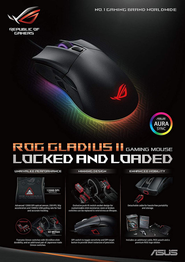 ASUS ROG Gladius II Aura Sync USB Wired Optical Ergonomic Gaming Mouse