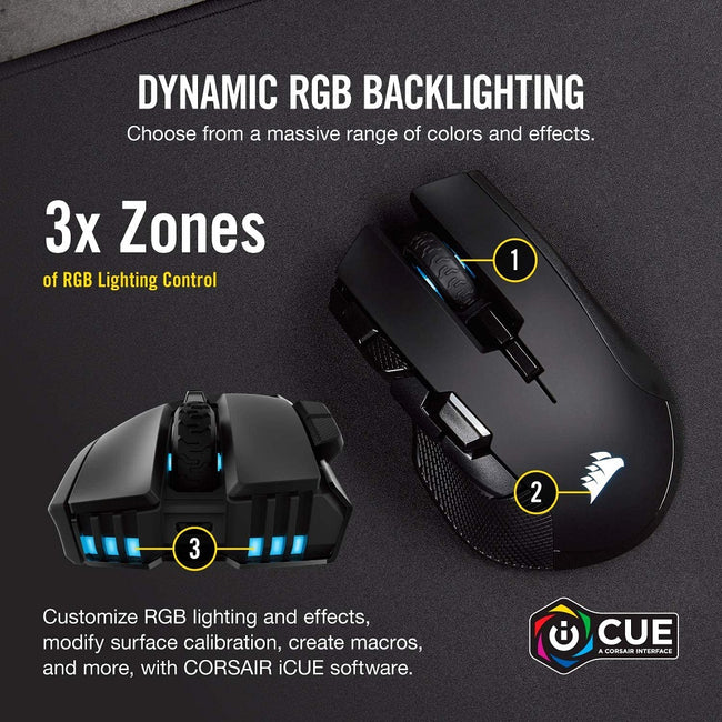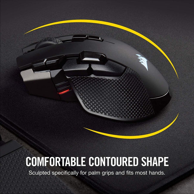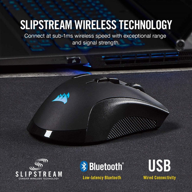 | Features | Three Ways to Game: Connect with hyper-fast, sub-1ms SLIPSTREAM CORSAIR WIRELESS TECHNOLOGY, lowlatency Bluetooth, or USB wired. Comfort When It Counts: Contoured shape that’s sculpted specifically for palm-grips and larger hands. Powerfully Precise Optical Gaming Sensor: A custom Pixart PMW3391 native 18,000 dpi sensor, adjustable in 1 dpi resolution steps, gives you total sensitivity customization and ultra-accurate tracking. Ten Fully Programmable Buttons: Customize the way you play with powerful macros and key remaps to give you an in-game advantage. Ultra-Durable Omron Switches: Rated for more than 50 million clicks. Dynamic, Three-Zone RGB Backlighting: Choose from dozens of customizable presets and effects to perfectly match your setup. Onboard Profile Storage: Take your settings with you, with hardware macro playback and lighting control. Up to 50 hours of Battery Life*: Play uninterrupted with battery life that lasts for days, or plug in for wired mode to keep playing while charging. Intelligent Control, Unlimited Possibilities: CORSAIR iCUE software enables vivid dynamic RGB lighting control, sophisticated macro programming and full-system lighting synchronization across compatible CORSAIR peripherals, coolers, fans and more. Surface Calibration Tuning Utility: Automatically tailors responsiveness and precision based on your individual playing surface. *when using Bluetooth connection |