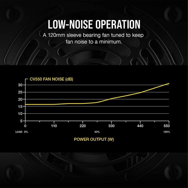 A 120mm thermally controlled low-noise cooling fan only spins at high speed when your power supply is under heavy stress, slowing down for quieter operation at lower loads.