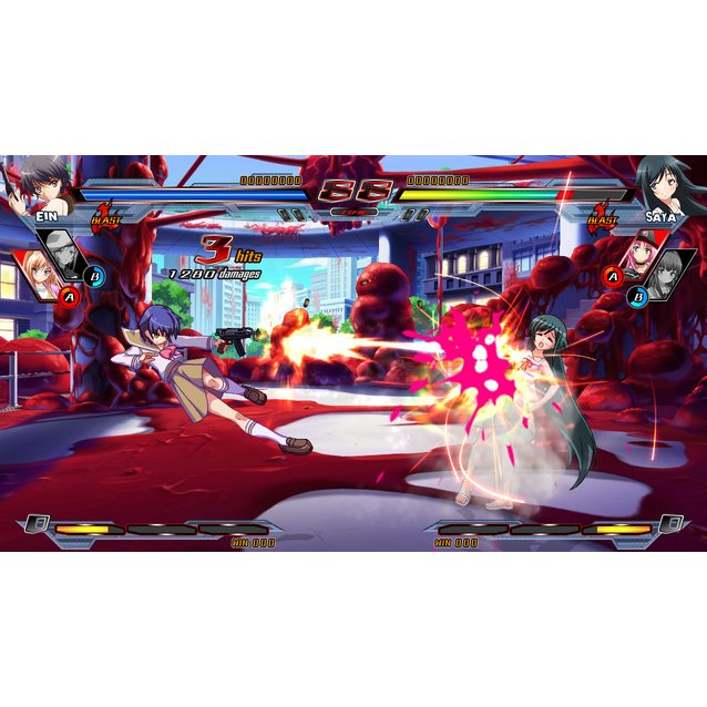With 14 playable characters and 18 support characters for 32 in total, Nitroplus Blasterz Heroines Infinite Duel features a fivebutton system (light, medium, heavy attacks + heavy and escape action) that focuses on interrupts via an "infinite blast" move. This combined with 2 support characters, an extremely fast pace, as well as individual fighting styles per main makes for some exciting anime action, all in the "animation-to-life" presentation that Examu is known for.