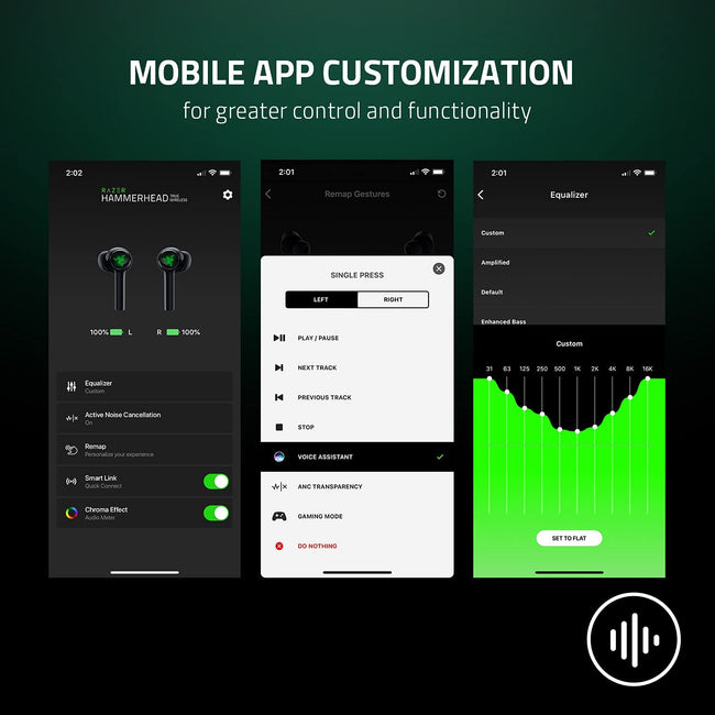 Mobile App CustomizationMaximize your earbuds with the Razer Audio app. Tweak Razer Chroma RGB settings, remap touch gestures, customize the EQ, and get continuous improvements with over-the-air firmware updates. |