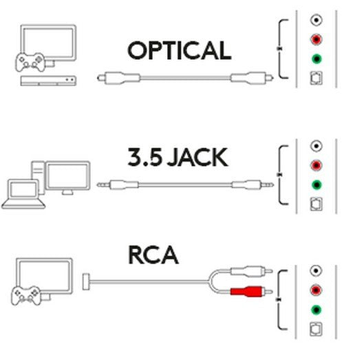 Versatile SetupPlug in up to three devices simultaneously like your game console, TV and computer via the optical, 3.5mm and RCA inputs. No need to disconnect when switching between audio sources. Connect them once and you’re set. |