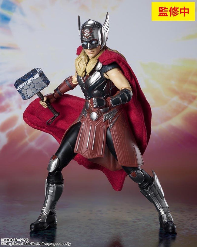 Mighty Thor, also known as Jane Foster, joins the S.H.Figuarts action-figure lineup from Bandai! Thor's ex-girlfriend wears an elegant set of armor with an overskirt and a masked helmet; an interchangeable head includes a digitally colored portrait of Natalie Portman! Her legendary axe Mjolnir is also included, as is an effect part for summoning lightning. Her fabric cloak features a wired edge for dramatic posing! Order her for your own collection today!