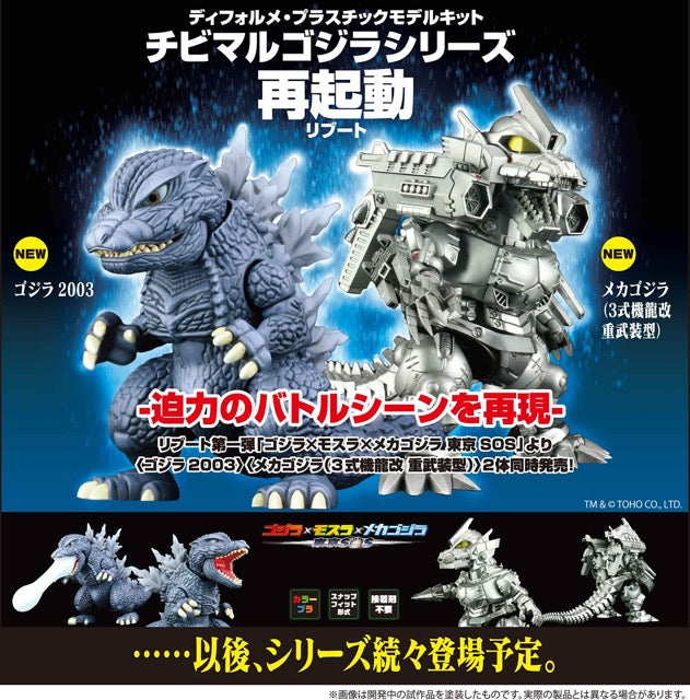 Mechagodzilla (Type 3 Kiryu Kai Heavy Armed Type) joins the "Chibi Maru" super-deformed model-kit series from Fujimi! As seen in 2003's "Godzilla x Mothra x Mechagodzilla: Tokyo SOS," this massive beast includes newly molded parts: a new back unit, a chest-mounted triple hypermaser cannon, a right-hand spiral claw, and a pair of forearm-mounted Type 4 railguns! New neck parts are included as well. He's movable at the neck, limbs and tail after assembly, and the chest-mounted maser cannon can be opened or closed. This kit assembles easily without tools or glue! Waterslide decals and three-color stickers are included as well. Order this mighty mech for your own collection today!