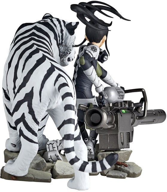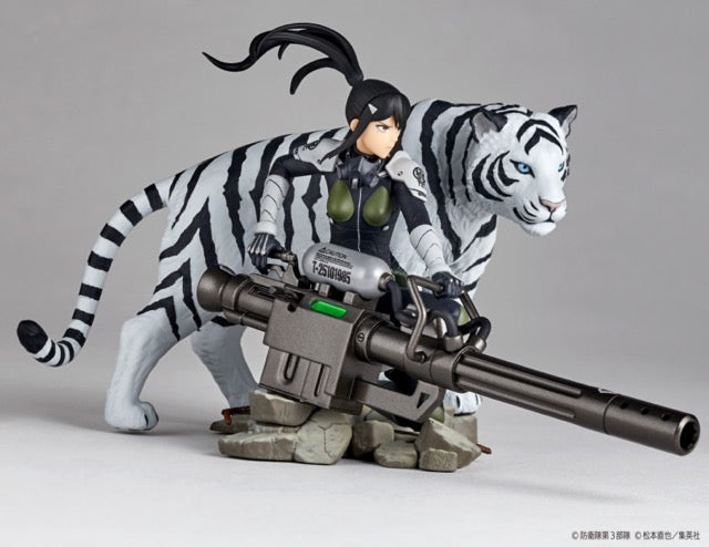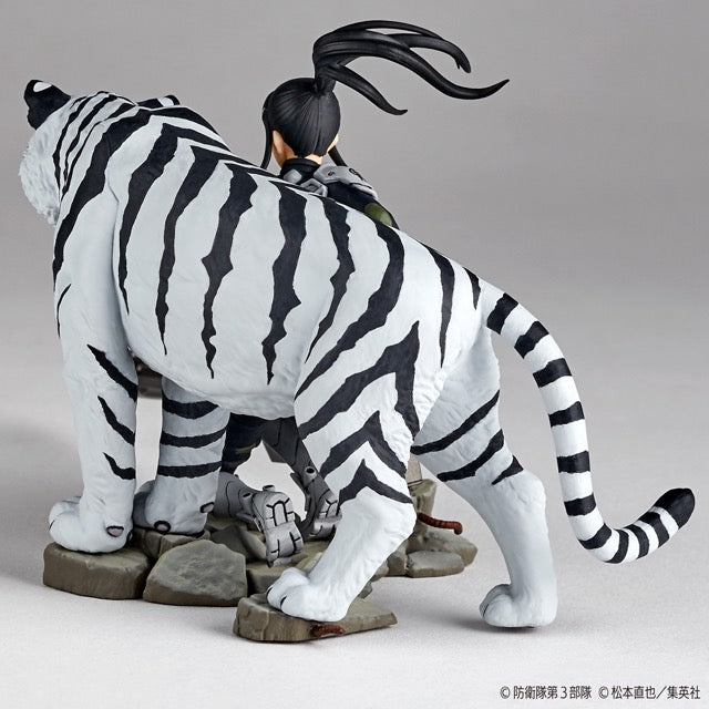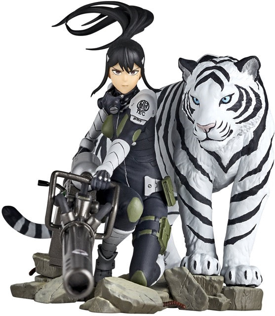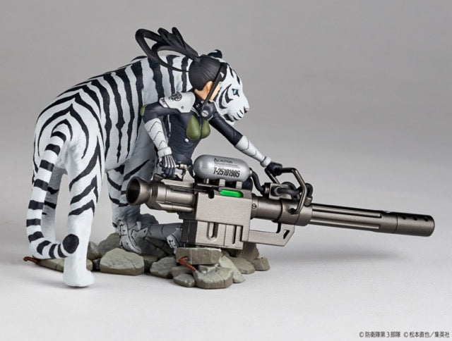 Mina Ashiro from "Kaiju No. 8" poses with her partner Bakko in this new figure from Kaiyodo! She holds a huge firearm with practiced ease, her long hair flowing in the breeze, and waits grimly for her target to come into view; Bakko waits patiently at her side, his stillness conveying his coiled power! Everything about this figure is precisely crafted, including Mina's battle suit, her weapon, and even the rubble at her feet. Bakko's powerful physique contrasts with Mina's slim build, each emphasizing the other's strength. Mina's massive weapon is roughly 12cm long to make a big impression, too! Order this atmospheric figure for your own collection today!