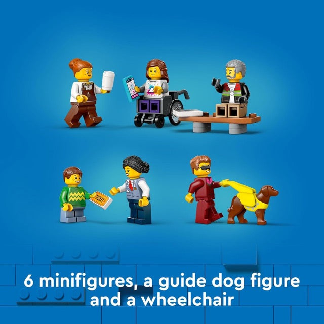 Kids get a toy streetcar, station and 6 minifigures, including characters with a guide dog and a wheelchair.