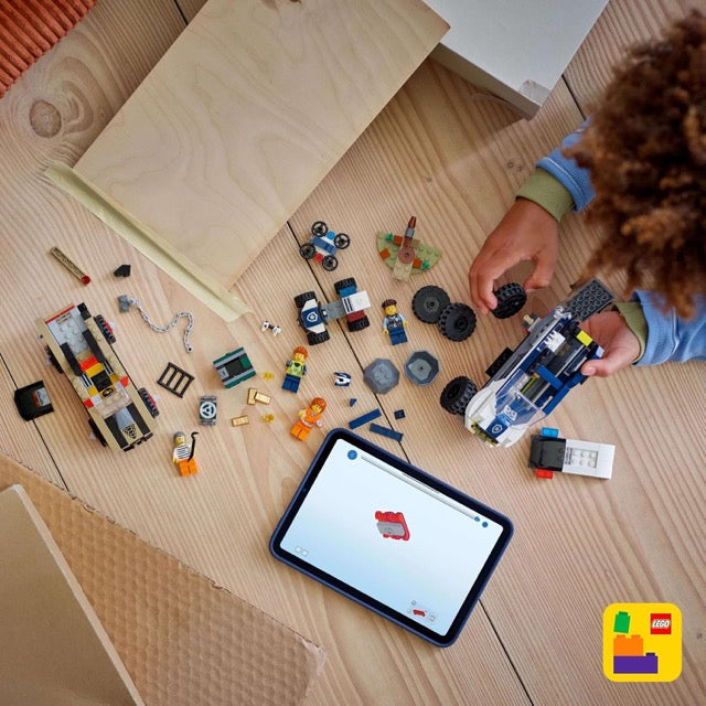 This police toy building set includes a printed building guide and step-by-step digital instructions in the LEGO Builder app – a digital building companion with intuitive zoom and rotate tools that enable kids to visualize models from all angles as they build.