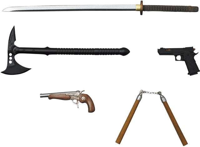 Standing at approximately 160mm tall, this figure captures the essence of the protagonist of the movie "John Wick: Chapter 4." It comes with two interchangeable head parts and an additional upper body part without the jacket. Prepare for action with the included impressive array of weapon parts. Plus, it comes with a poseable figure stand for dynamic display options.