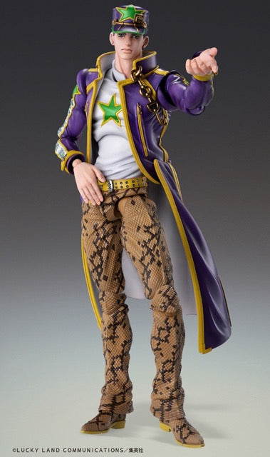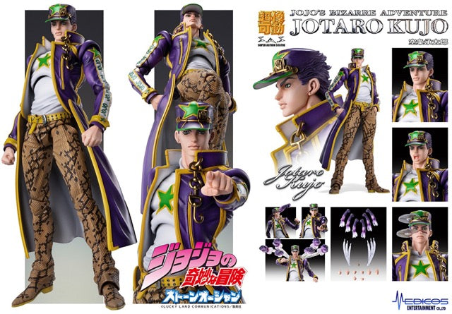 Jotaro Kujo from "JoJo's Bizarre Adventure Part 6: Stone Ocean" is now a "Super Action" figure from Medicos! His iconic hat and the characteristic snakeskin pattern on his outfit are carefully reproduced; his jacket is also fully detailed. He comes with two different interchangeable heads: a shouting expression, and one head with two DISCs imbedded in it thanks to an attack from Whitesnake! Effect parts for the Oraora Rush are also included; and of course, he's insanely posable for all kinds of cool poses. Order him today!