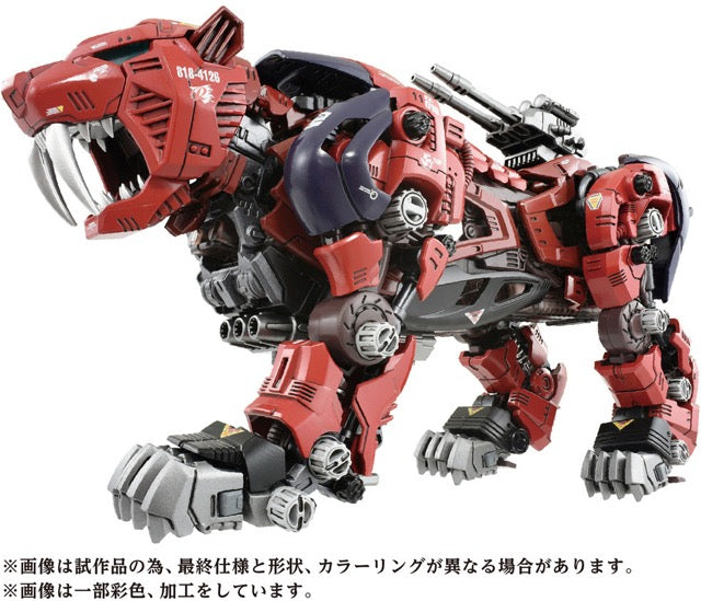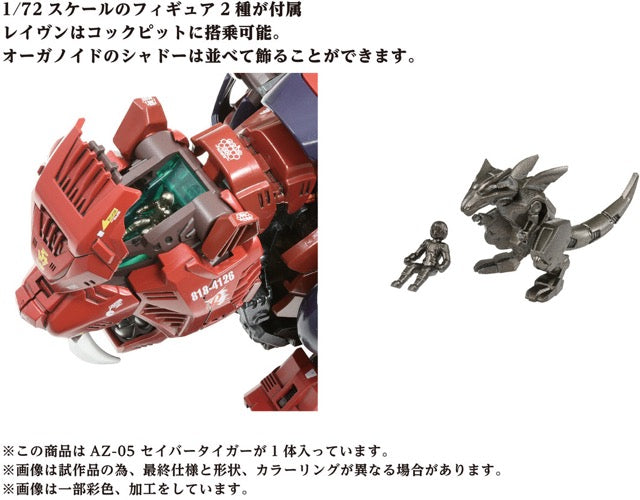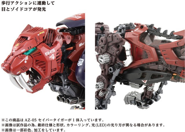 The AZ-05 Saber Tiger from "Zoids" is the ultimate Zoid to commemorate the series's 40th anniversary, with lifelike movement and improved animation! Turn on the electric unit after assembling this gorgeous and highly detailed model kit to reproduce the realistic walk cycle, and its eyes and chest will light up with LEDs. This kit reproduces the coloring of Raven's machine from the anime, and a 1/72-scale figure of Raven is included who can ride in the cockpit; an unpainted figure of an Organoid shadow is also included. A base is included for display in motion. Order this outstanding kit for your own collection today!