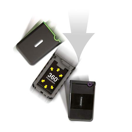The StoreJet 25M3 features a three-stage shock protection system that meets US military drop-test standards to fully protect data stored on the drive. The three-stage shock protection system includes a silicone rubber case, an internal shock-absorbing suspension damper, and a reinforced hard casing.