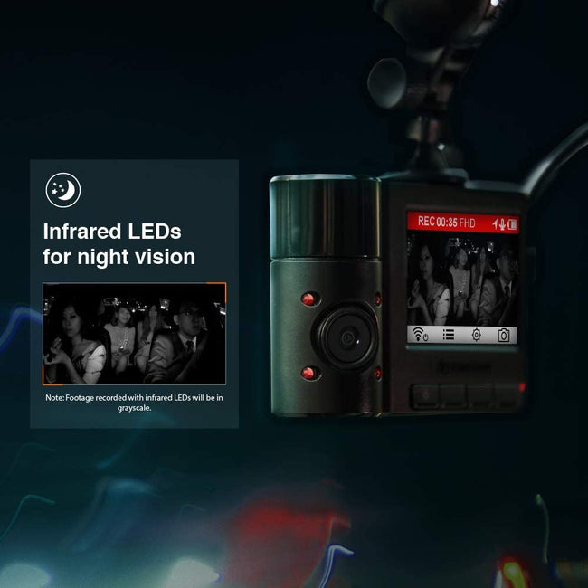 Infrared LEDs for night visionThe rear-lens camera has four infrared LEDs that will automatically turn on in dim light. This greatly improves recording quality, even in pitch-black darkness. Note: Footage recorded with infrared LEDs will be in grayscale. |
