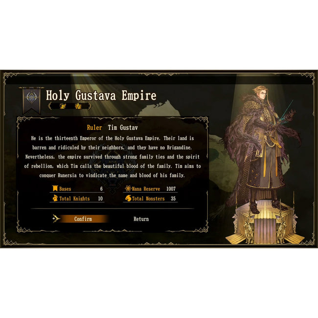 Brigandine: The Legend of Runersia is a grand strategy simulation game. Choose your faction and commander, and build an army of loyal troops, monsters, and war machines to conquer the continent.