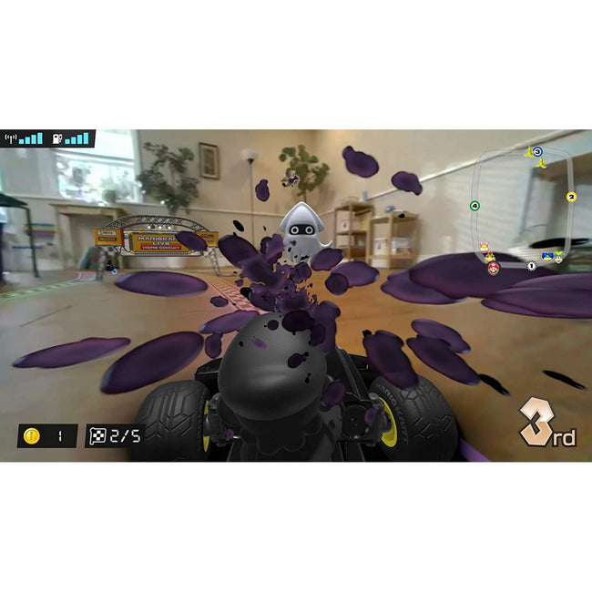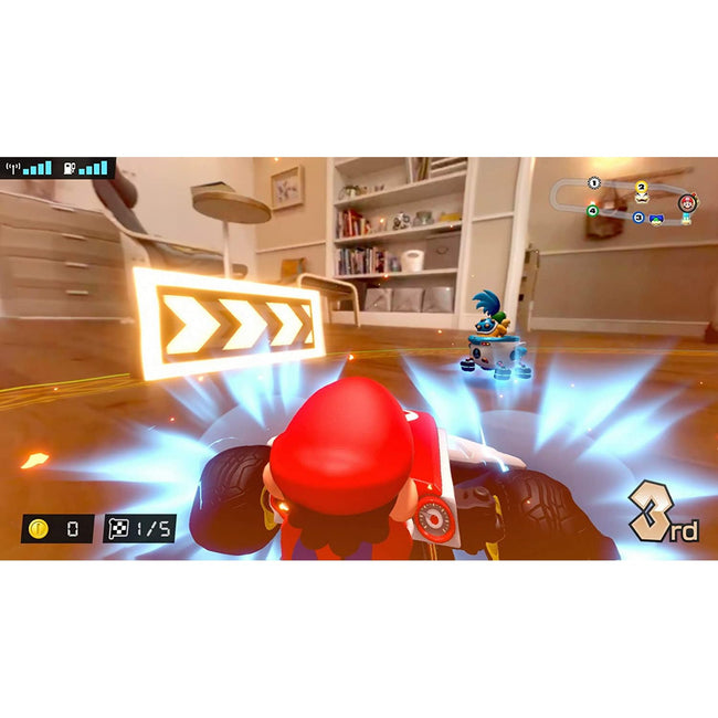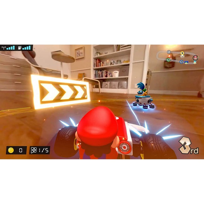 Control a real-life Mario Kart with Nintendo Switch and watch it come to life in the game!Race a real-world Mario Kart through your home! Use the Nintendo Switch system to control your kart and watch as it reacts to what’s happening in the game as you boost and drift to victory. Your in-home course comes to life on-screen with a view from right behind the driver’s seat.