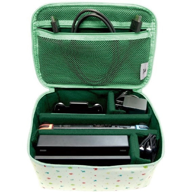 A Storage Bag with Animal Crossing designed to carry your Nintendo Switch, Switch Lite and other accessories related to it. It can carry the entire package of Nintendo Switch including Dock, Joy-Con Grip, AC adapter, Cables and more in one single storage box.