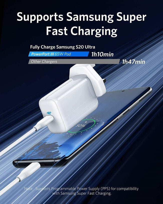 - Anker PowerPort III Pod 65W PIQ 3.0 PPS USB C Fast Charger (White)
