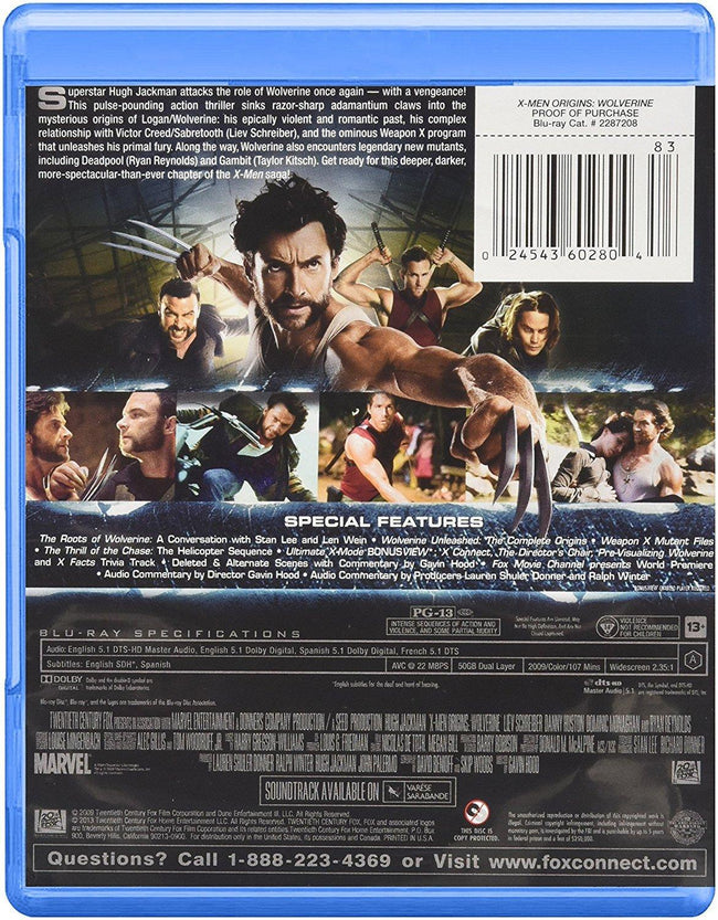 X-MEN: ORIGINS - Wolverine Format: NTSC, color, Blu-Ray, Language: English (Dolby TrueHD), French (DTS 5.1), Spanish (Dolby Digital 5.1) Region: All Number of discs: 1 Rated: PG-13 Parents Strongly Cautioned Studio: 20th Century Fox Release Date: January 10, 2017