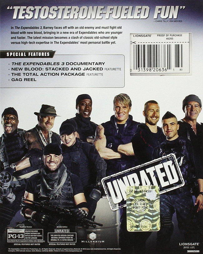 EXPENDABLES 3 Format: Blu-ray, DVD, Color, Widescreen Language: English Subtitles: Unknown Region: ALL(BR) /1(DVD) Aspect Ratio: 2.40:1 Number of discs: 2 Unrated Studio: Lionsgate Release Date: November 25, 2014 Run Time: 131 minutes