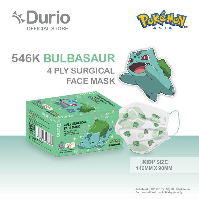 DURIO 546K Pokémon 4 Ply Surgical Face Mask (KID'S) - Bulbasaur - 40pcs